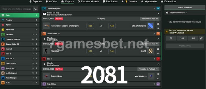 O 2081 oferece uma grande seleção de opções de apostas em e-sports com probabilidades competitivas